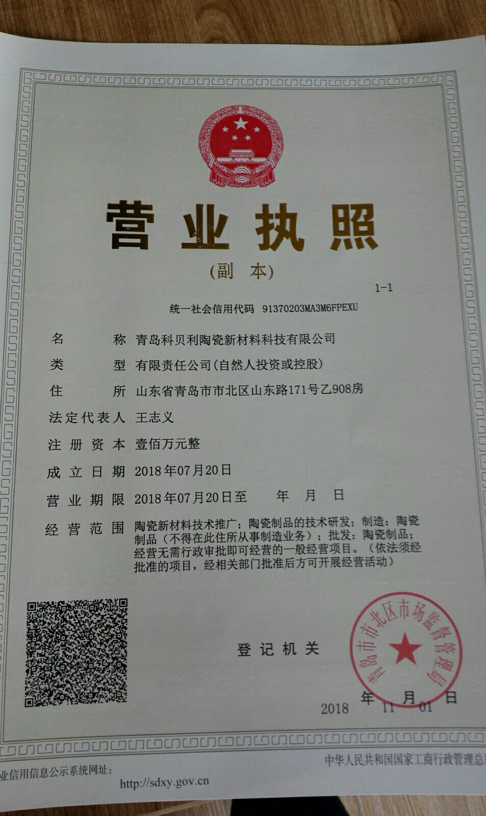 为贯彻学习党的十九大精神和习近平新时代中国特色社会主义思想,响应山东省“新旧动能转换”重大工程和学校“五有”高水平大学建设,yl23455永利官网王志义教授于2018年7月注册成立科技型、学科性公司--青岛科贝利陶瓷新材料科技有限公司,注册资本100万元人民币。